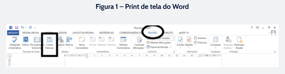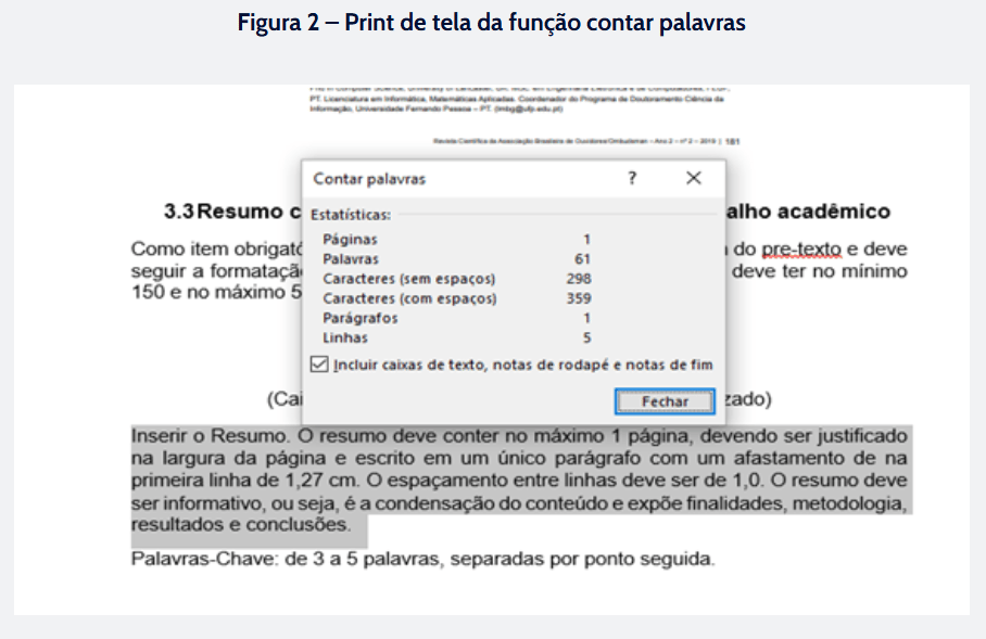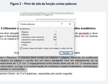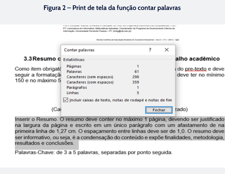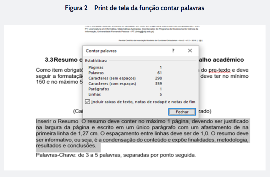 A quantidade mínima e máxima que o artigo deve conter deve ser obedecida rigidamente pelo autor do trabalho. Mas não precisa ficar contando manualmente. O editor de texto do word apresenta essa funcionalidade, tornando o trabalho mais fácil.